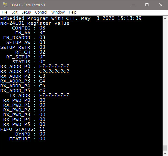 먼저 nrf24l01에 있는 레지스터의 기본 값이 제대로 읽히는지 확인하기 위하여 UART 콘솔에 표시해 본다.