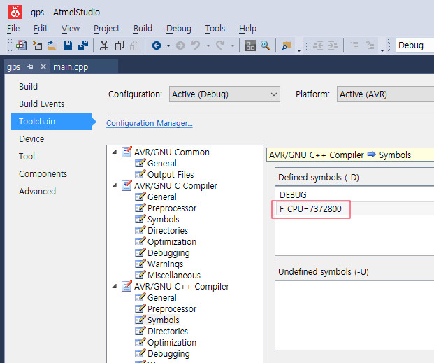 Atmega128A 프로젝트를 생성하고 CPU 클럭을 위 그림처럼 보드에 맞게 설정해 준다. 참고로 C++ 프로젝트로 진행할것이기 때문에 AVR/GNU C++ Compiler에서 Symbols를 선택하였지만, 만약 C 프로젝트라면 AVR/GNU C Compiler에 있는 Symbols를 선택한 후 F_CPU값을 입력해 주어야 한다.