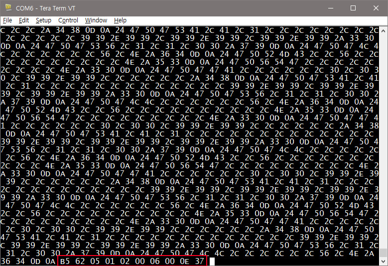 UART0에서 p키를 누르면 CFG-PRT 메시지를 내 보내도록 되어 있다. GPS 모듈에서 들어오는 모든 데이터를 헥사값으로 출력하도록 하였다.