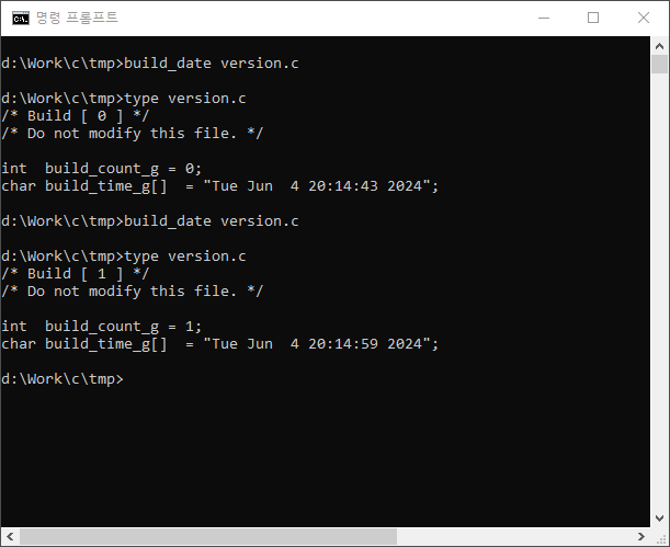 위의 그림처럼 build_date를 실행할 때마다 version.c 파일의 build_count_g의 값이 1씩 증가되고 build_time_g의 내용은 build_date를 실행하는 순간의 날짜와 시간으로 업데이트 되는것을 볼 수 있다. 이 방법을 이용하면 타겟 보드용 프로젝트를 빌드할때마다 그 순간으로 업데이트 된 정보를 이용할 수 있게 된다.