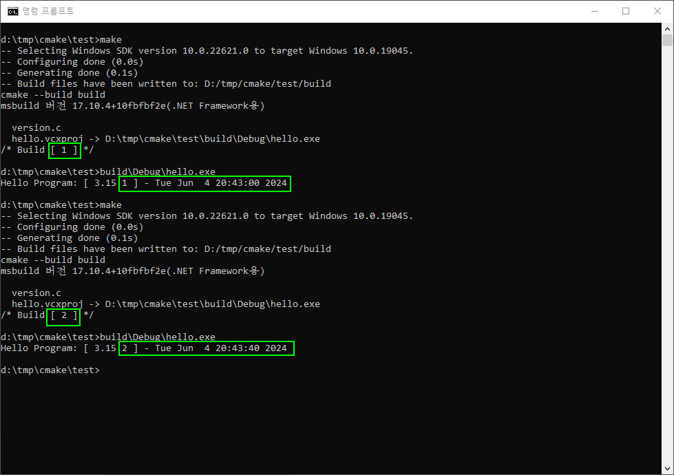 make 명령으로 프로젝트를 빌드한 다음 만들어진 파일을 실행했을때 자동으로 빌드 정보가 업데이트가 되는것을 볼 수 있다.